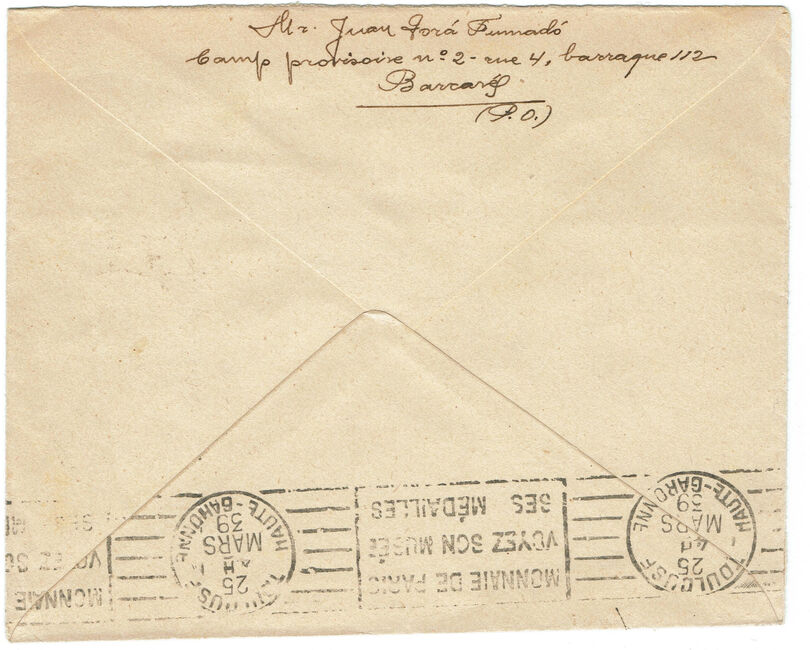 | 1939-03-24 | Lettre envoyée le 24 mars 1939 par un interné espagnol au camp du Barcarès, alors dénommé « camp provisoire ».
