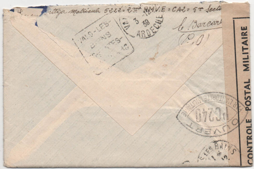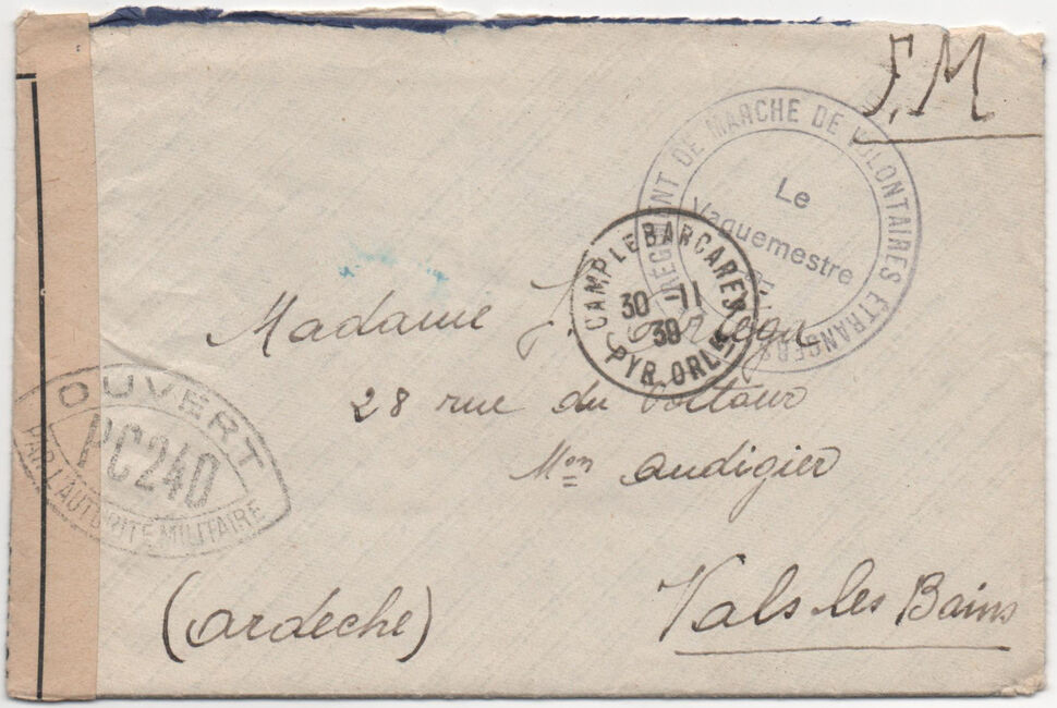 | 1939-11-30 | Lettre envoyée le 30 novembre 1939 du camp du Barcarès par un engagé probablement espagnol du 2e Régiment de Marche de Volontaires Étrangers à destination de Vals-les-Bains (Ardèche). La lettre est revêtue du cachet du 2e RMVE qui justifie la franchise militaire et a été postée du bureau de poste du camp. Elle a été contrôlée par la commission PC240 de Perpignan (Pyrénées-Orientales).
