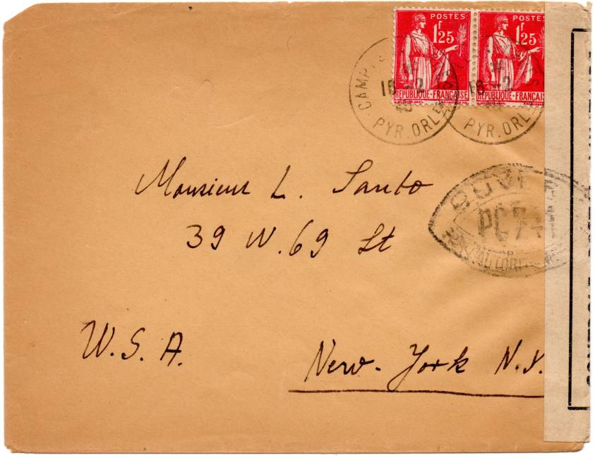 | 1940-02-16 | Lettre envoyée le 16 février 1940 du camp du Barcarès par un engagé 1e Régiment de Marche de Volontaires Étrangers à destination de New-York City (USA). La lettre a été postée du bureau de poste du camp. Etant adressée à l'étranger, elle ne bénéficie pas de la franchise. Elle a été contrôlée par la commission PC241 de Perpignan (Pyrénées-Orientales).