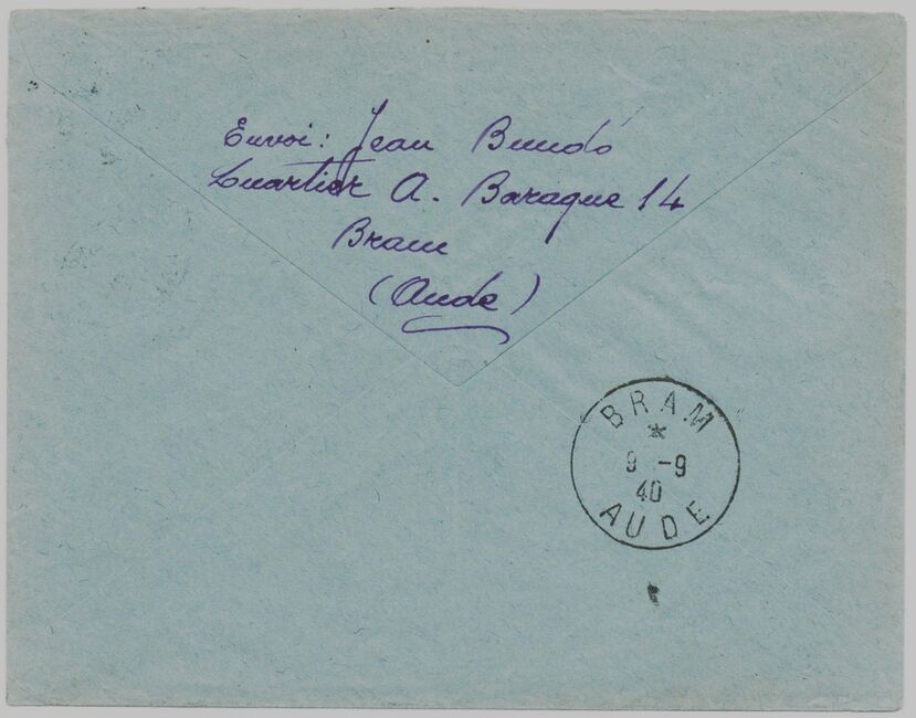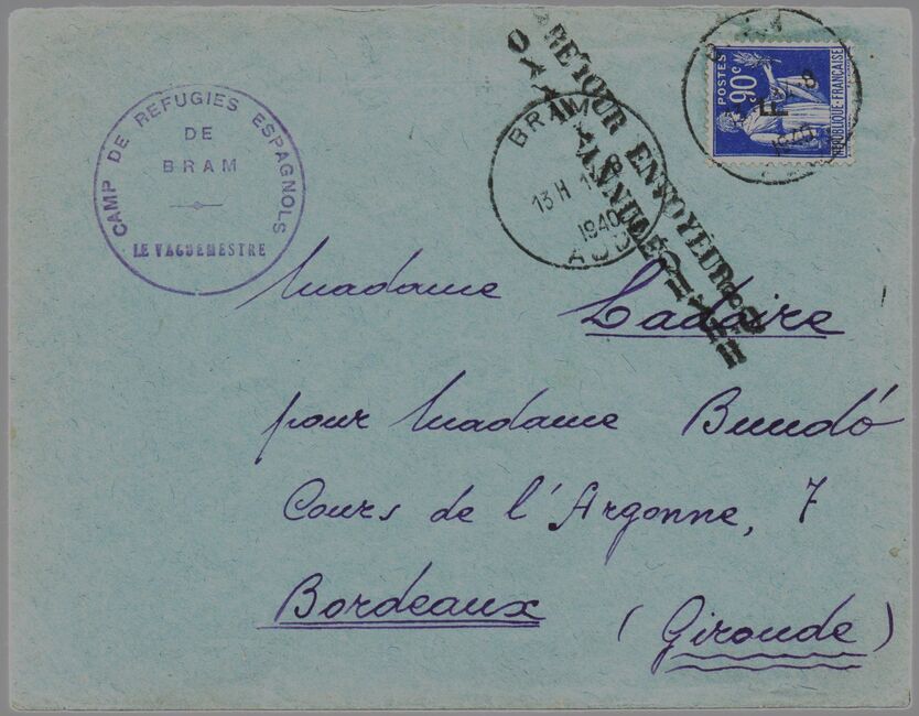 | 1940-08-14 | Lettre envoyée le 14 août 1940 par un interné espagnol au camp de Bram (quartier A barraque 14) à destination de Bordeaux. Les relations postales entre zone occupée et zone non occupée étant interrompue, la lettre a été refoulée (griffe « retour envoyeur - annulé ») et est revenue à Bram le 9 septembre 1940.