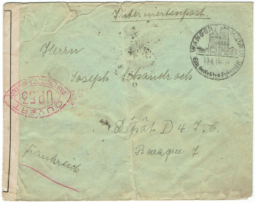 | 1940-04-22 | Lettre envoyée le 22 avril 1940 de Wangen (Allemagne) à destination d’un interné civil au dépôt D4IC de Damigny (Orne). Passage par le bureau Paris centralisateur le 2 mai 1940 et censure UP53.