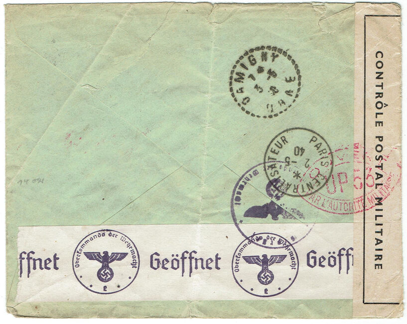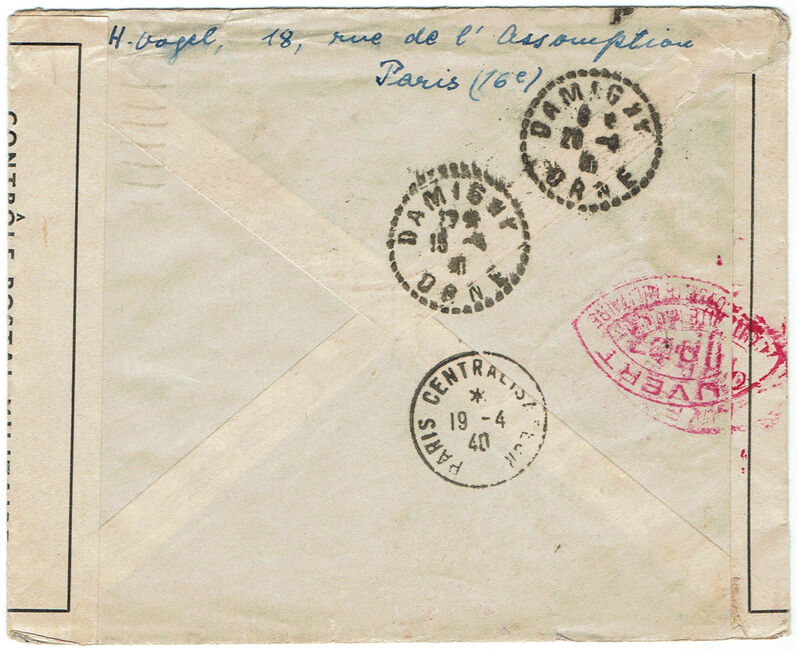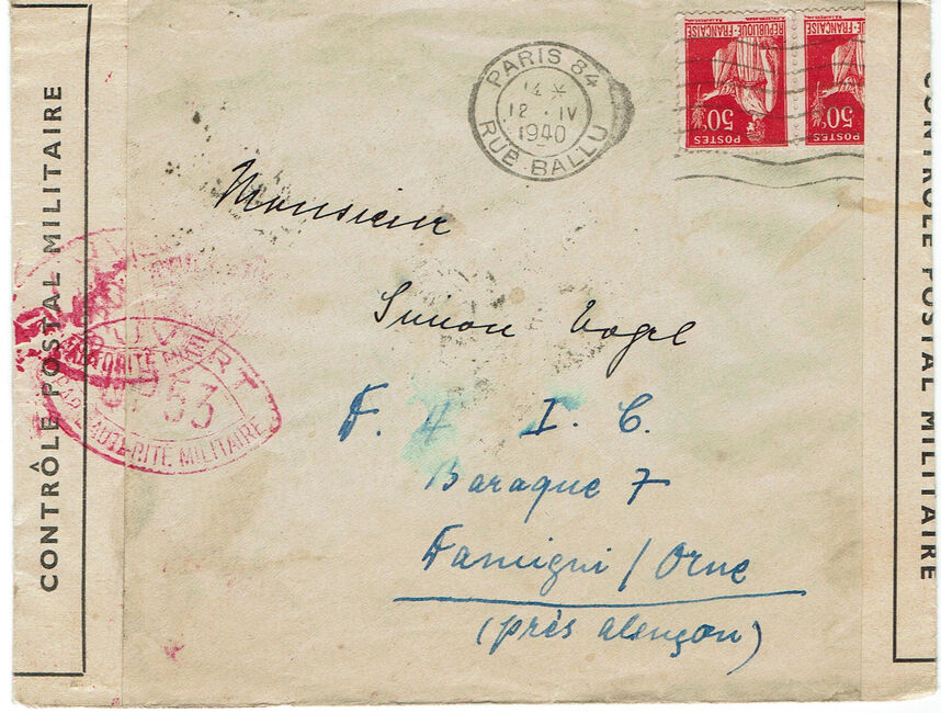 | 1940-04-12 | Lettre envoyée le 12 avril 1940 de Paris à destination d’un interné civil au dépôt D4IC de Damigny (Orne). Passage par le bureau Paris centralisateur le 19 avril 1940 et censure UP53.