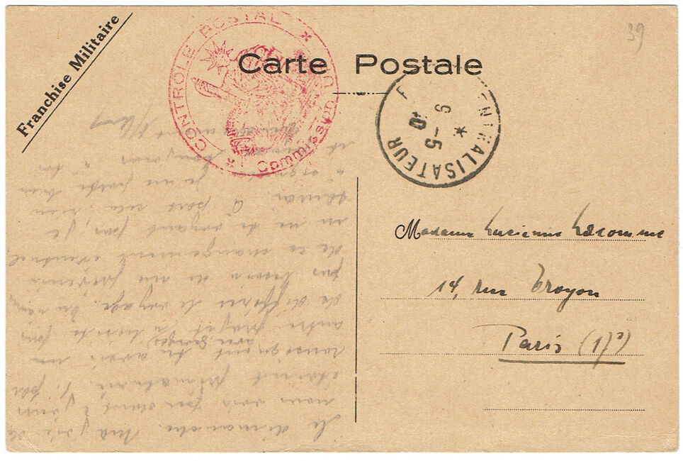 | 1940-05-06 | Carte écrite le 6 mai 1940 (date manuscrite) depuis le camp d’internés civils de Damigny (Orne) via le bureau Paris 15 de la rue d’Alleray qui a apposé un cachet Paris-centralisateur le 9 mai 1940, puis passage via la commission de censure UP (prisonniers de guerre).