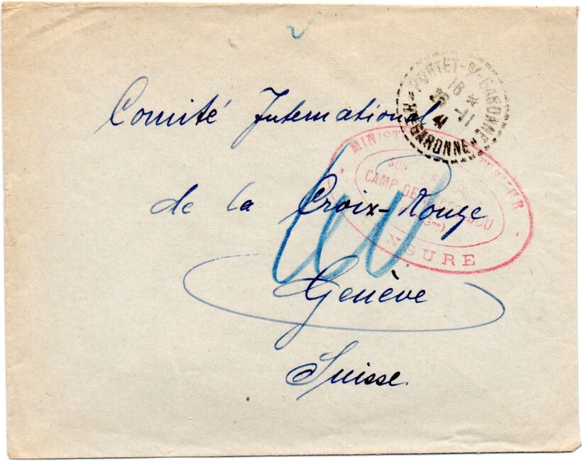 | 1940-11-25 | Lettre envoyée le 26 novembre 1941 de Portet-sur-Garonne par un interné au camp de Récébedou, à destination de la Croix-Rouge à Genève. La lettre est envoyée non-affranchie, alors que les internés civils ne bénéficient d'aucune franchise. Le courrier a été visé par la censure du camp.