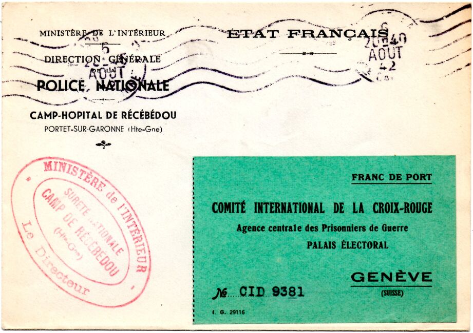 | 1942-08-06 | Lettre à en-tête du camp-hôpital de Récébedou envoyée le 6 août 1942 de Portet-sur-Garonne à destination de la Croix-Rouge à Genève. Le courrier porte également un cachet administratif du directeur du camp.