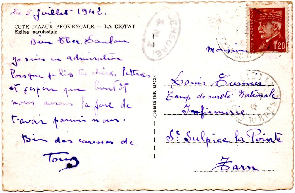 | 1942-07-05 | Carte envoyée le 5 juillet 1942 à destination d'un interné au camp de la Sureté Nationale de St-Sulpice-la-Pointe (Tarn) avec cachetd e contrôle du camp S.N.2