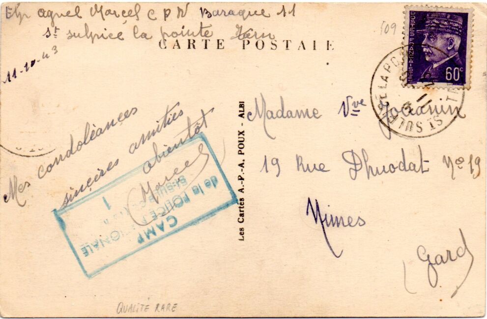 | 1943-10-11 | Carte envoyée le 11 octobre 1943 par un interné au centre de St-Sulpice-la-Pointe à destination de Nîmes (Gard) avec cachet de censure du camp de la Police Nationale de St-Sulpice-la-Pointe – 1.