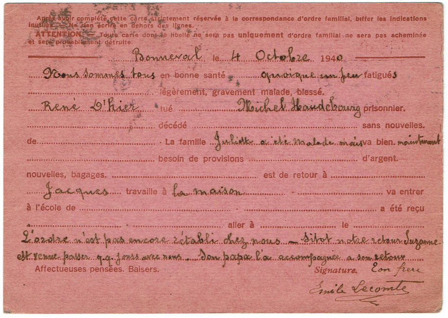 La correspondance entre la zone occupée et la zone non-occupée sont interdites depuis l'armistice du 22 juin 1940. Les autorités allemandes fixent la reprise de la correspondance interzones au 1er août 1940, mais les modalités de la correspondance familiale ne sont pas encore en place.