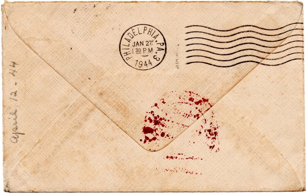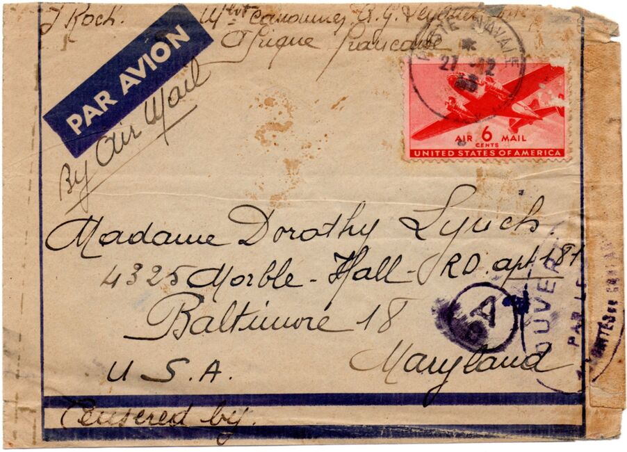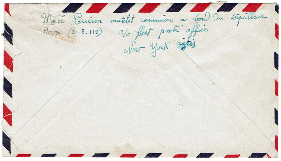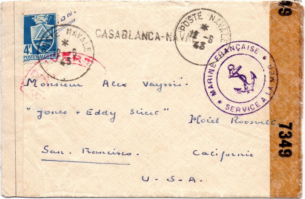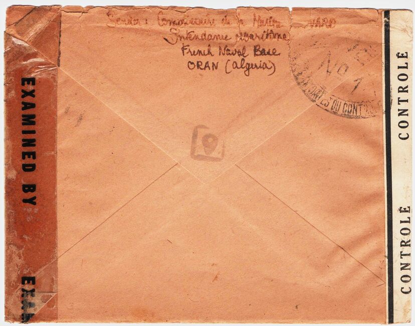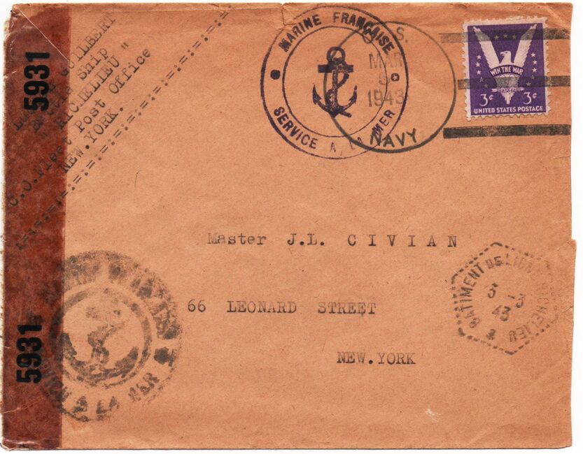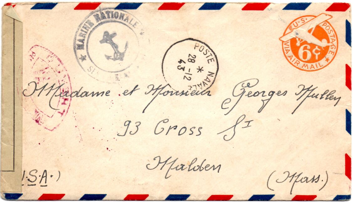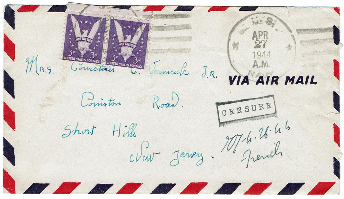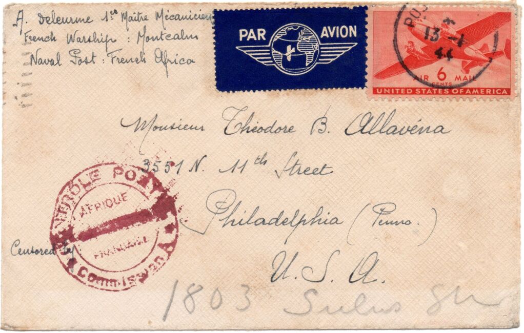 Lettre envoyée le 27 avril 1944 par un marin du Torpilleur Hova à destination de sa marraine de guerre américaine à Short Hills (New-Jersey) avec marque « censure » française mais contresigné par un censeur américain, oblitérée par l’US Navy. Le torpilleur Hova (Destroyer Escort 110) est un navire qui vient alors d’être construit aux USA et d’être rétrocédé aux Forces Françaises Navales Libres dans le cadre de la loi « lend lease ».