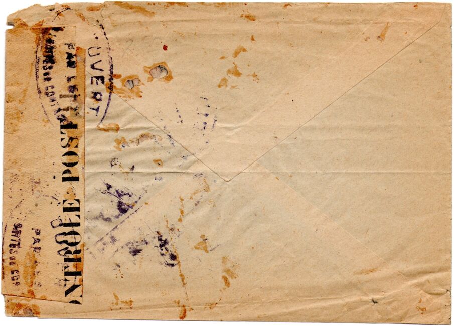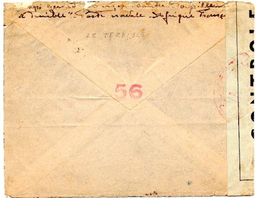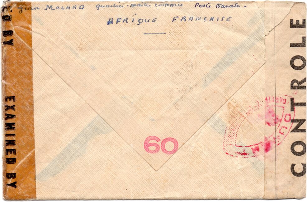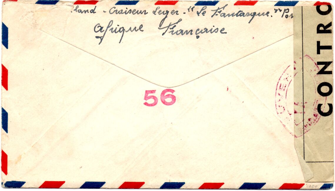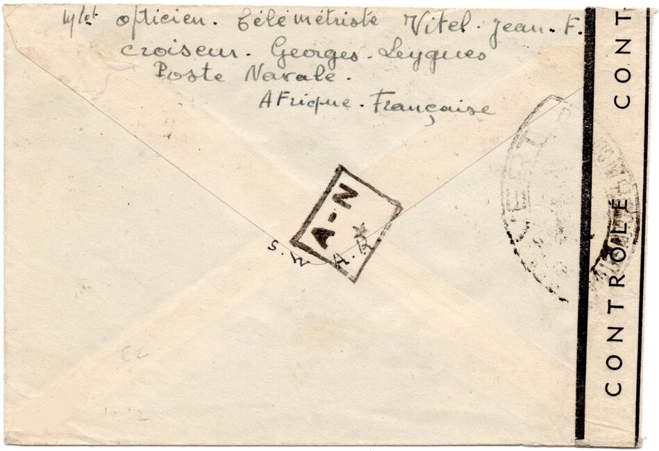 Quelques lettres en provenance de navires stationnés en Afrique-Occidentale française ont été controlées au moyen d'un cachet circulaire du contrôle postal (commission A de Dakar) de l'AOF dont le mot occidentale a été masqué. Ces cachets sont appliqués en noir ou en rouge.
