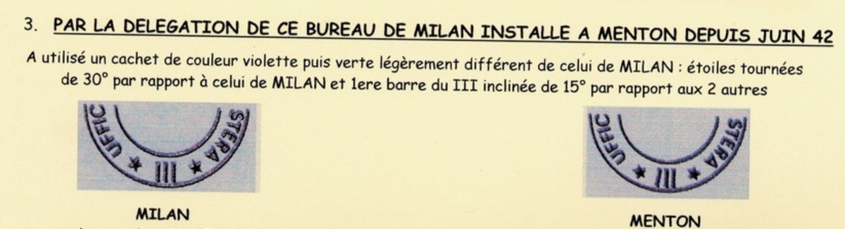 Attention toutefois, le cachet dit de Mentone se trouve également sur des courrier contrôlés à Milan! davantage de recherche est nécessaire! Il est néanmoins constaté que le cachet frappé en vert se trouve uniquement sur du courrier de Mentone, et que des codes de lecteurs sont exclusivement consacrés au contrôle du courrier de Mentone. Toutefois rien de semble attester formellement l'installation d'une commission à Mentone même.