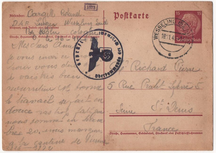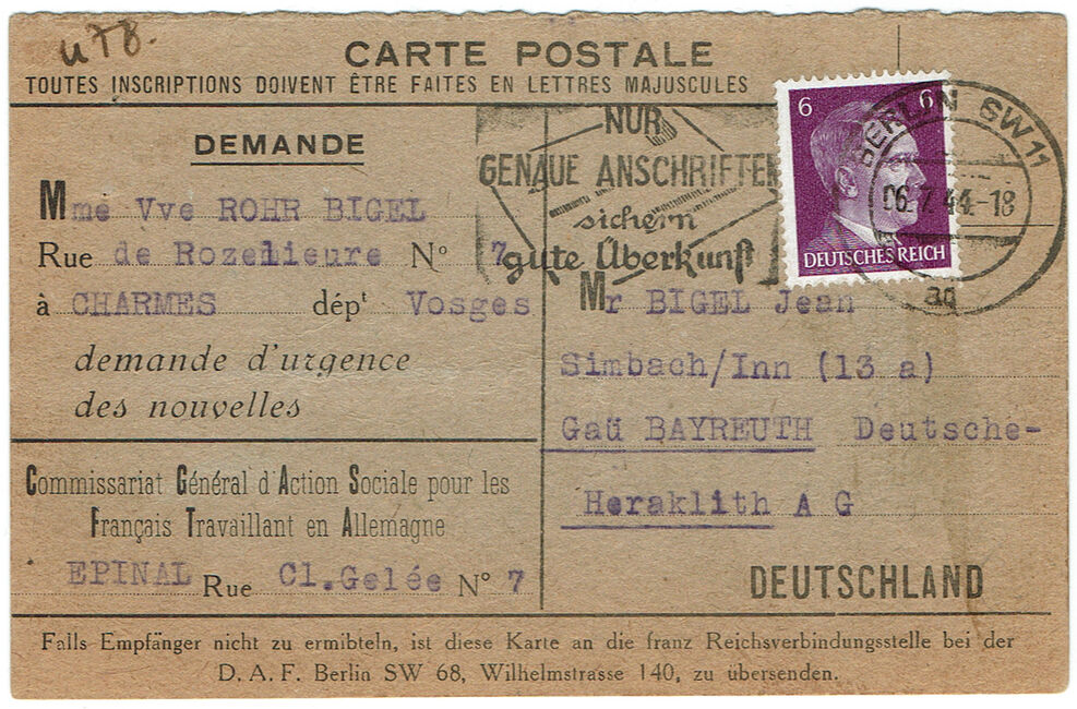 Suite aux débarquements et à la progression des Alliés en France, les relations postales entre la France et l'Allemagne sont interrompues. Le courrier des prisonniers de guerre continue à être acheminé en vertu de la convention de Genève, mais il n'en est pas de même pour les courriers des ouvriers français en Allemagne.
