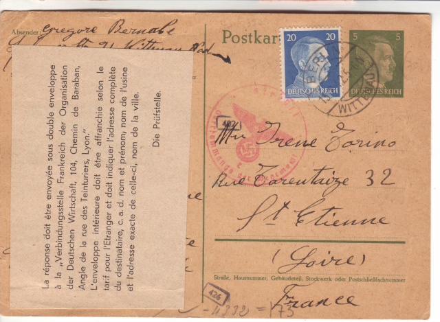 Carte d'un ouvrier en Allemagne envoyée de Berlin le 15 août 1942 à destination de Saint-Étienne (zone non-occupée) avec étiquette de l'A.B.P Francfort expliquant la procédure de la double enveloppe. (merci à Jean pour le cliché).