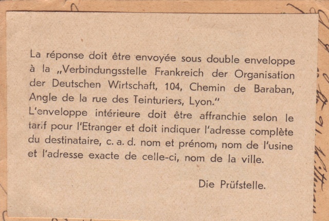 On apprend dans l'article du Journal des Débats Politiques et Littéraires du 3 août 1942 qu'un système de double enveloppe est institué afin de permettre l'échange du courrier ouvrier entre la zone sud et l'Allemagne. Le courrier transite via un organisme allemand basé à Lyon, le Centre en France des organisations économiques allemandes (Verbindungsstelle Frankreich der Organisation der Deutschen Wirtschaft) et via le centre de contrôle postal de Francfort (A.B.P Francfort).