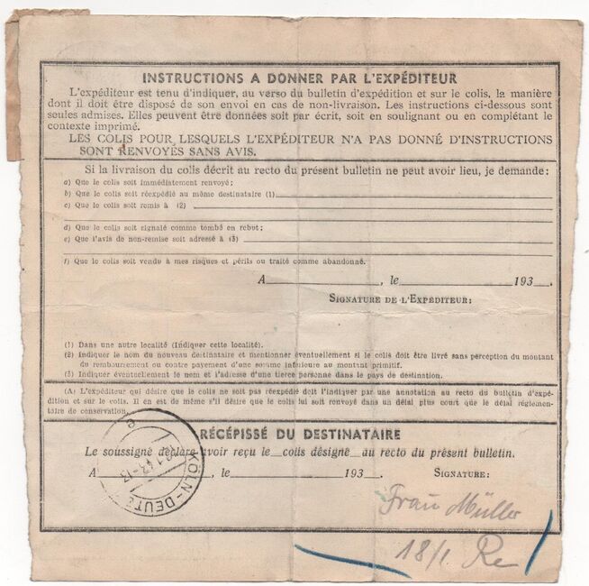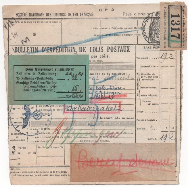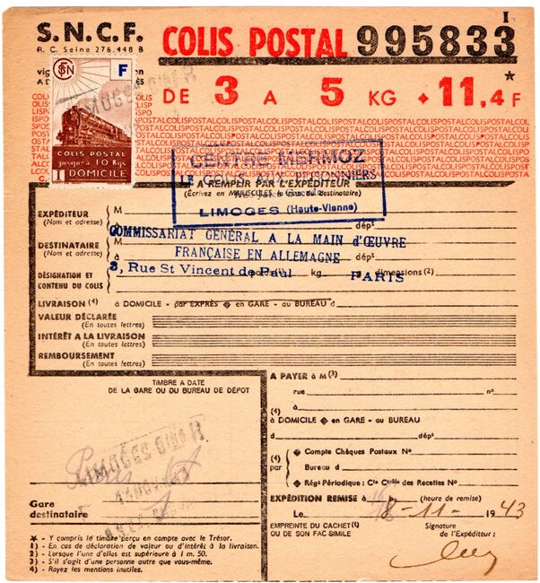 Bulletin d'expédition de colis Arbeiterpaket à destination d'un travailleur français en Allemagne (cachet de transit à Cologne le 13 janvier 1943). L'expéditeur du colis conservait la partie gauche du bordereau. Le prix du transport (19,20 F) est indiqué sur le bordereau. Une taxe de dédoudanement de 55 Pfennig a été en outre perçue par la douane allemande (étiquette verte).