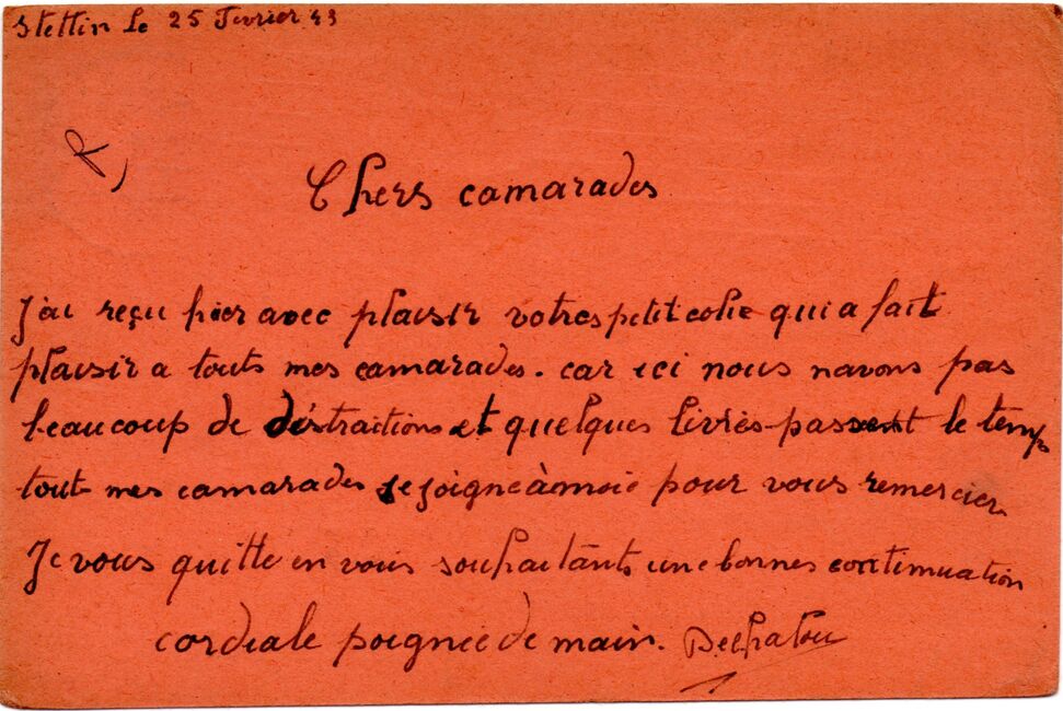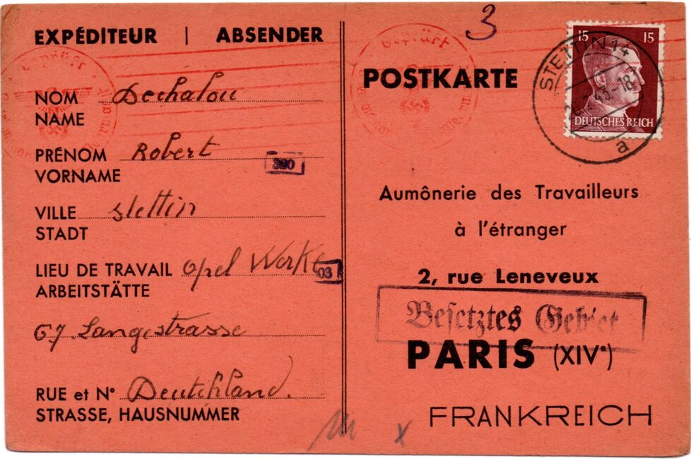 Carte adressée par un ouvrier français de l'usine Opel à Stettin à l'Aumônerie des Travailleurs à l'étranger à Paris. La carte est envoyée le 26 février et a été contrôlée par l'A.B.P Francfort.