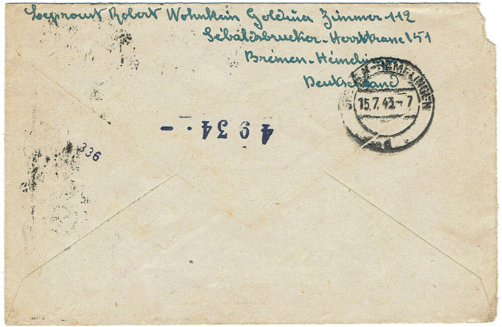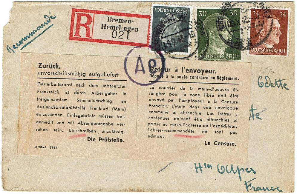 Lettre recommandée envoyée de Bremen le 9 septembre 1943 à destination de La Montagne de Romette (Hautes-Alpes), zone non-occupée, avec étiquette de retour bilingue apposée par l'A.B.P Francfort. Modèle d'étiquette Nr. 78. 15000. 8.43 K/0942-5693. Les lettres recommandées envoyées par les ouvriers français en Allemagne à destination de la zone non-occupée sont interdites depuis avril 1943.