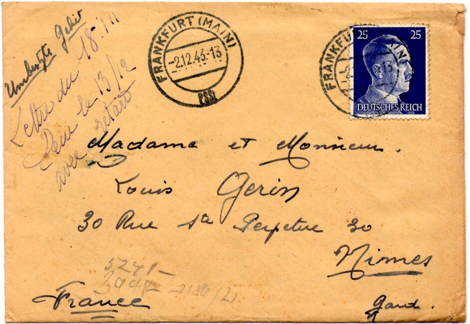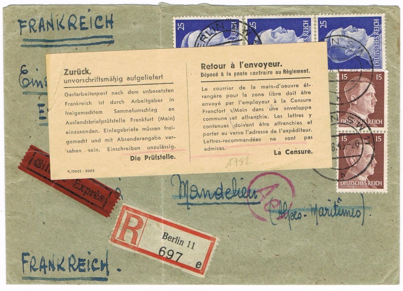 Au titre des restrictions, on peut également mentionner l'interdiction à partir d'avril 1943 d'échanger des lettres recommandées, par exprès ou par avion avec la zone sud (Note PO. 5 du 20 avril 1943 relative au courrier des travailleurs français en Allemagne). Les lettres postées après l'entrée en vigueur de cette interdiction ont été renvoyées par l'A.B.P Francfort après apposition d'une étiquette explicative.