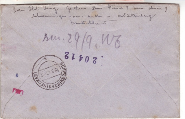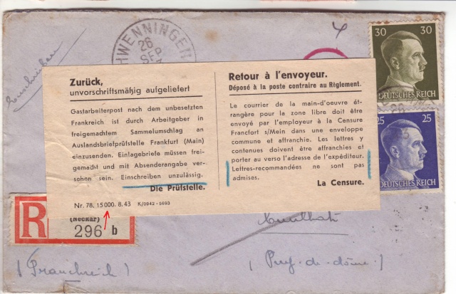 Lettre recommandée envoyée de Schwenningen le 26 septembre 1943 à destination de Cunlhat dans le Puy-de-Dôme (zone non occupée) avec étiquette de retour apposée par l'A.B.P Francfort. Modèle d'étiquette Nr. 78. 15000. 8.43 K/0942-5693 (merci à Jean pour le cliché).