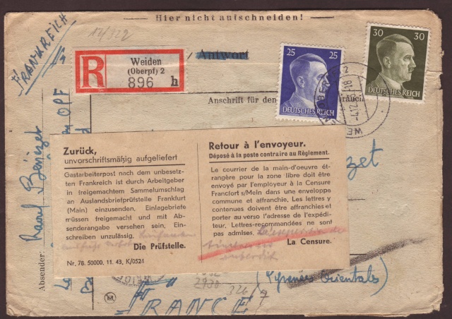 Lettre recommandée envoyée de Weiden le 12 décembre 1943 à destination de Perpignan dans les Pyrénées-Orientales (zone non occupée) avec étiquette de retour apposée par l'A.B.P Francfort. Modèle d'étiquette Nr. 78. 50000. 11.43 K/0524 - réf. Landsmann EZ1.4. (merci à Jean pour le cliché).