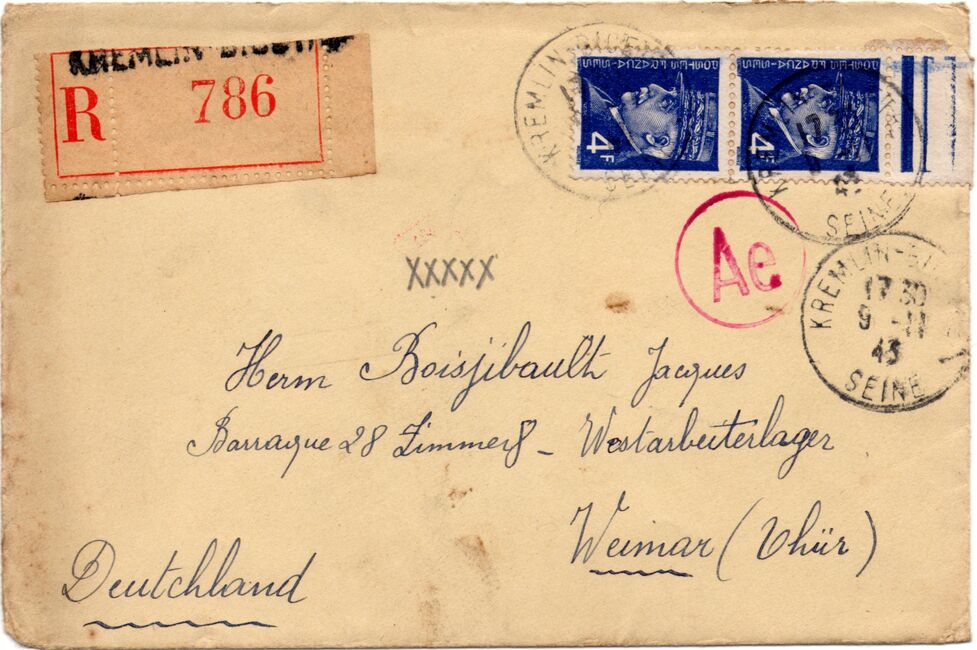 Lettre recommandée envoyée le 9 novembre 1943 à destination d'un ouvrier français à Weimar. A partir de d'avril 1943, les courriers recommandés ne pouvaient être échangés qu'entre l'Allemagne et la zone nord. La lettre a été contrôlée par l'Auslandsbriefbrüfstelle Francfort (cachet rouge Ae).