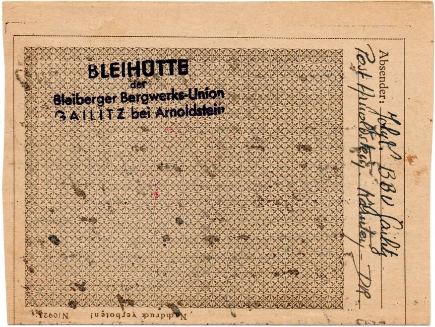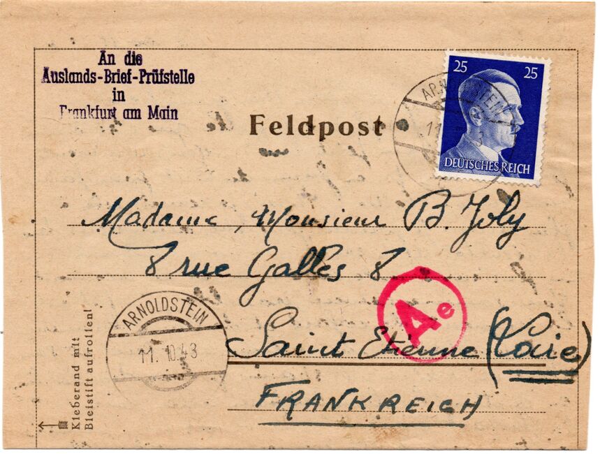 Carte-lettre envoyée par un ouvrier français de la fonderie de plomb de Gailitz, près d'Arnoldstein (Autriche) le 21 octobre 1943 à destination de Saint-Etienne (ex zone non occupée). On remarque la mention en haut à gauche an die Auslands-Brief-Prüftselle in Frankfurt am Main : les relations postales étaient en effet normalement très restreintes entre l'Allemagne et la France de Vichy, et des dispositions particulières réglementaient le courrier échangé entre les ouvriers en Allemagne et leur proches en zone non occupée. L'A.B.P Francfort contrôlait ce courrier échangé entre les ouvriers français et leurs correspondants et a apposé le cachet rouge Ae.