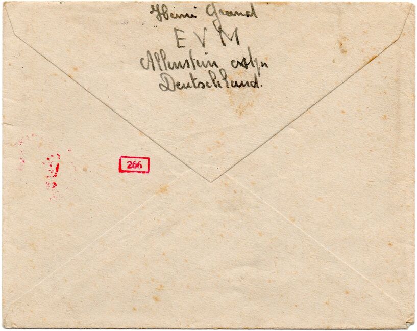 Lettre envoyée par un ouvrier français d'Allenstein à destination de Caluire et Cuire (près de Lyon, ex zone non occupée). Là encore la lettre a été remise directement par l'employeur à l'A.B.P Francfort qui l'a transmise à la poste : cachet rouge Ae et marque de lecteur 266 de l'A.B.P Francfort, et cachet Frankfurt (Main) - Postsammelstelle du 10 février 1944.