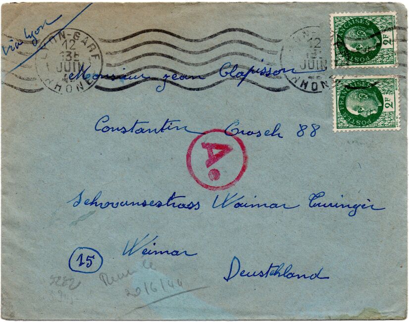 Lettre envoyée de Lyon le 12 juin 1944 à destination d'un ouvrier à Weimar. La mention via Lyon est portée sur l'enveloppe conformément aux instructions du 8 décembre 1942. Elle est obligatoire pour tout courrier ouvrier en provenance de la zone Sud du 8 décembre 1942 au 13 juillet 1944 (alors que les relations postales entre la zone Sud et l'Allemagne sont restreintes au courrier économique important et au courrier ouvrier).