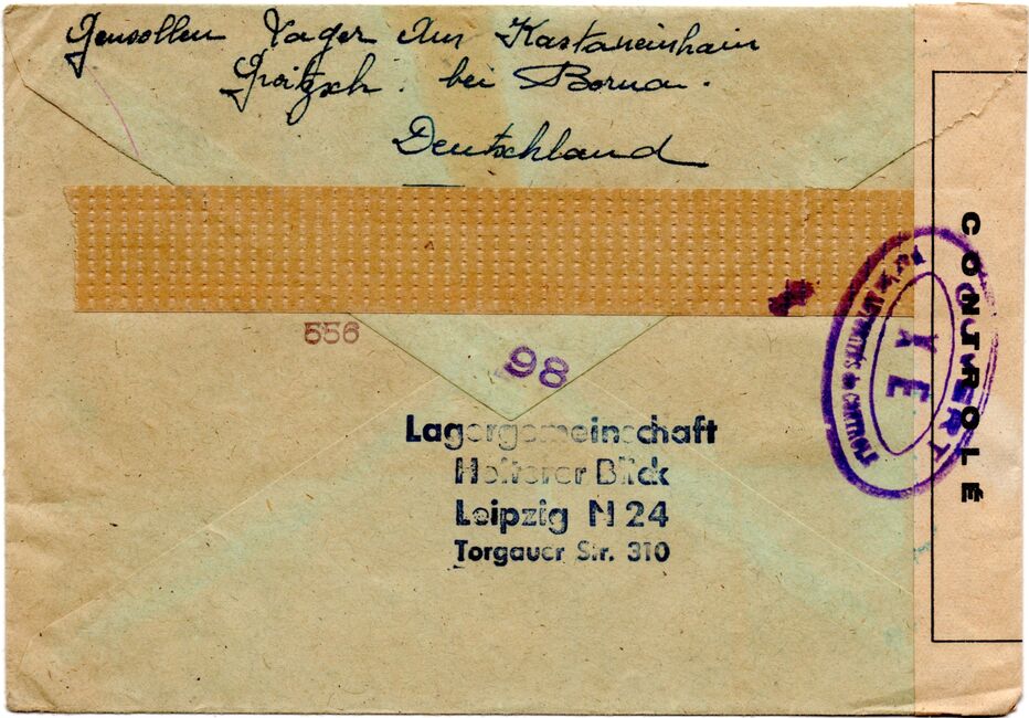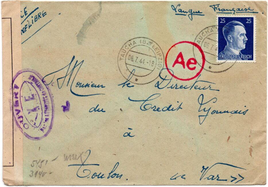 Lettre envoyée par un ouvrier français à Leipzig à destination de Toulon (ex zone non occupée) le 6 juillet 1944 avec double contrôle de l'ABP Ae de Francfort et la commission XE de Marseille. Au dos, un cachet indique l'adresse du lieu d'hébergement de l'ouvrier. Les mentions zone libre et langue française sont imposées pour le courrier à destination de la zone sud.