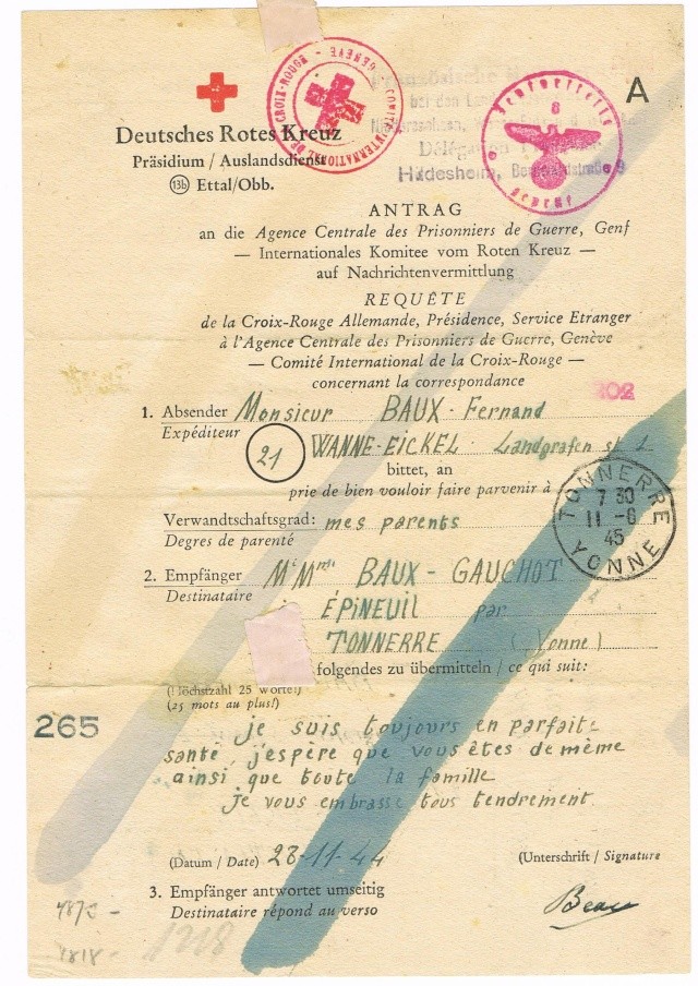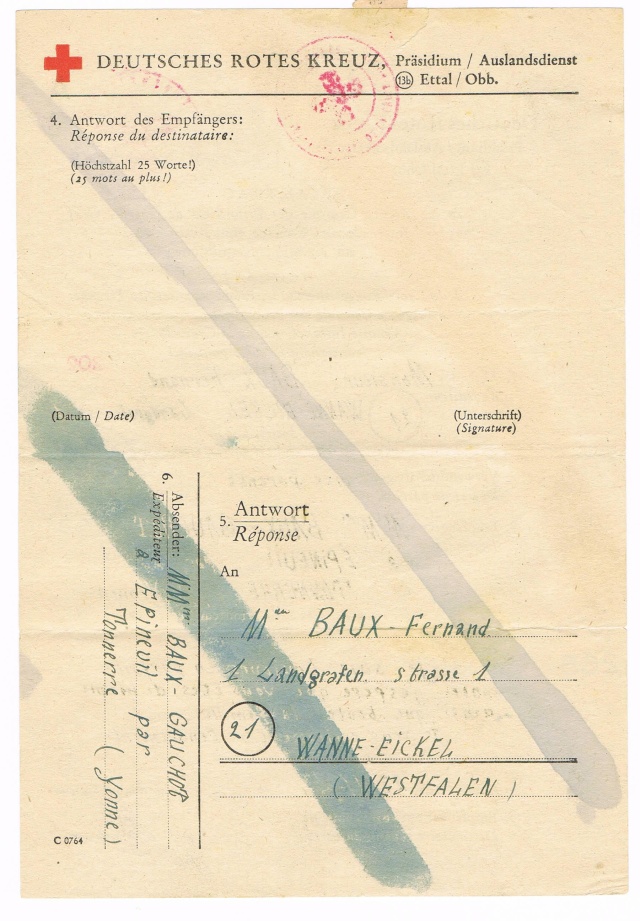 Les correspondances entre la France et l'Allemagne pouvaient se faire comme indiqué par la griffe française via les messages Croix-Rouge qui transitaient par Genève. Les délais d'acheminement étaient toutefois très longs, de l'ordre de 6 mois!