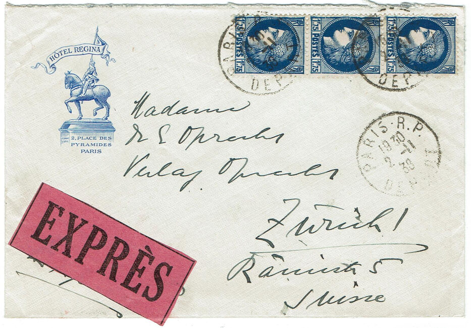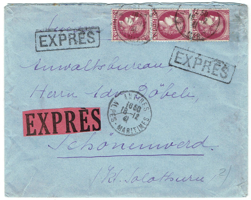 3,75 f. | 4,75 f. | 5,75 f. | 6,75 f. | 7,75 f. | 8,75 f. | 9,75 f. | 10,75 f. | 11,75 f. | 12,75 f. | 13,75 f. | + 1 f. | Taxe spéciale sur les correspondances à distribuer par exprès 3,50 f. soit pour une lettre à distribuer par exprès, par échelon |