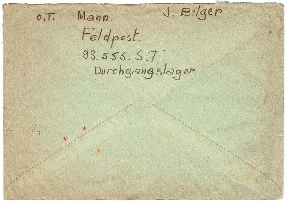 Lettre envoyée le 14 octobre 1943 par un français affecté à un camp de travail de l’organisation Todt à Trondheim (Norvège) à destination de Paris. Le cachet de service confirme le numéro de Feldpost 39555. Contrôle Ae de l’A.B.P Francfort.