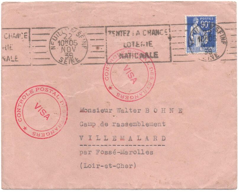 Lettre envoyée le 22 septembre 1939 à un interné allemand du camp de Villemallard. Le cachet de censure circulaire « Visa – Contrôle postal des Etrangers » est commun à plusieurs camps du Loir-et-Cher.