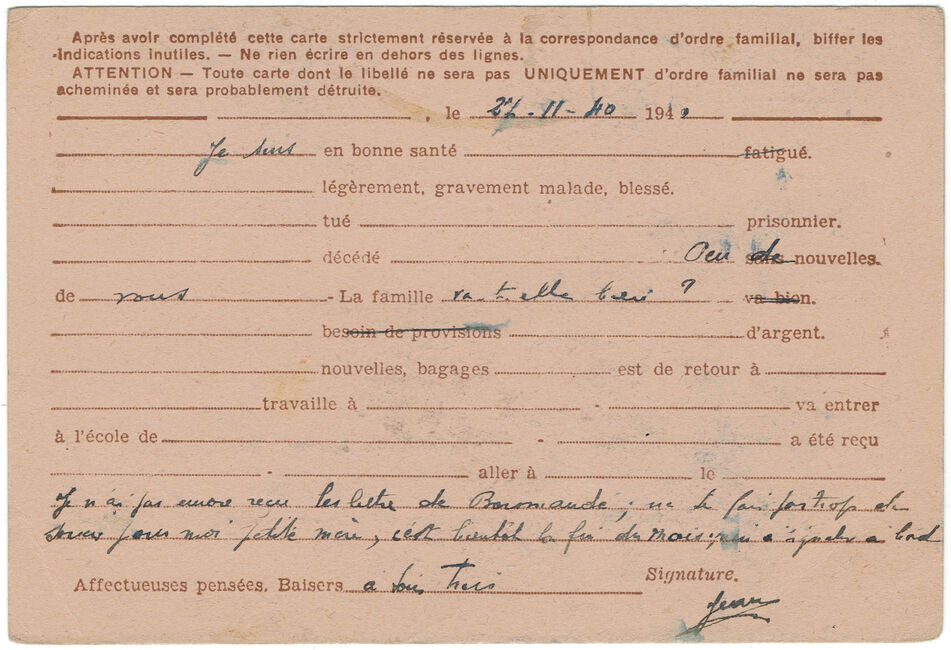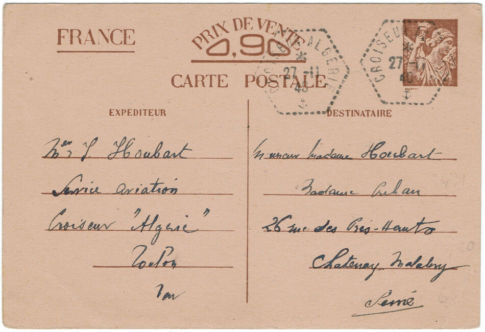 Carte postale interzones envoyée le 27 novembre 1940 par un marin du croiseur Algérie alors à Toulon (Var) à destination de Chatenay-Malabry (Seine).