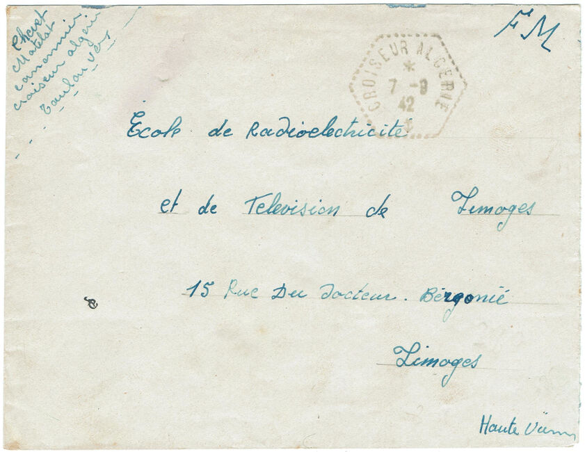 Lettre envoyée le 7 septembre 1942 par un matelot canonnier du croiseur Algérie à destination de Limoges (Haute-Vienne).