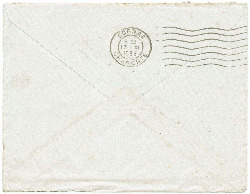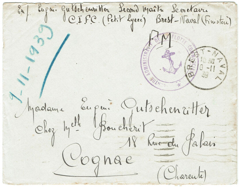 | 1939-11-10 | Lettre envoyée le 10 novembre 1939 de Brest-naval à destination de Cognac (Charente).