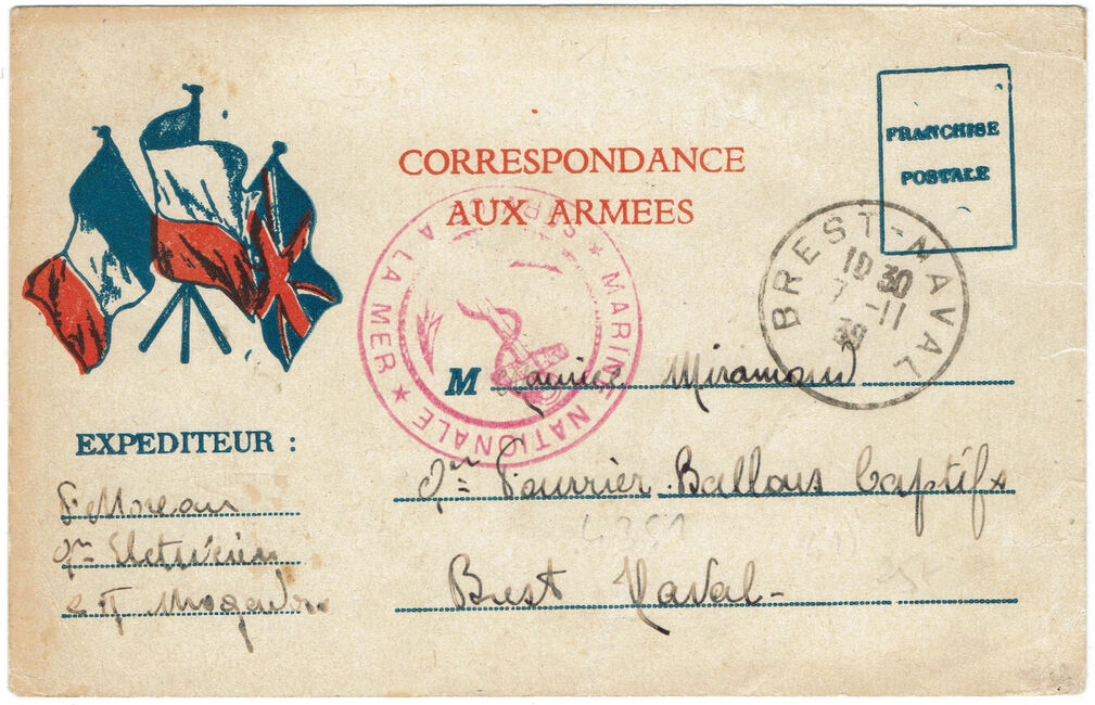 | 1939-11-07 | Carte postale de franchise militaire envoyée le 7 novembre 1939 à destination de Brest-naval.