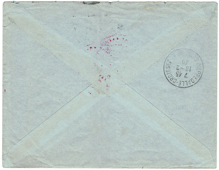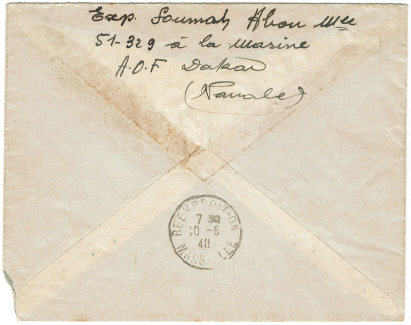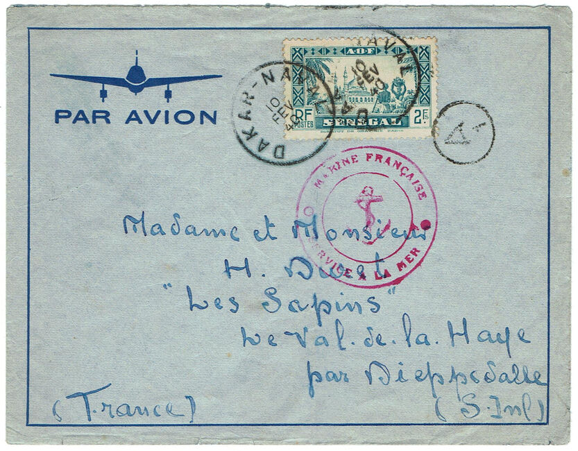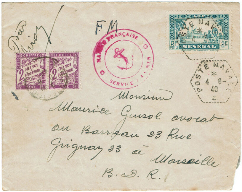Lettre envoyée le 4 juin 1940 de la base de Dakar-naval. L’affranchissement avion a été oblitérée du cachet hexagonal générique « poste navale ».Celui-ci étant insuffisant la lettre a été taxée au double.