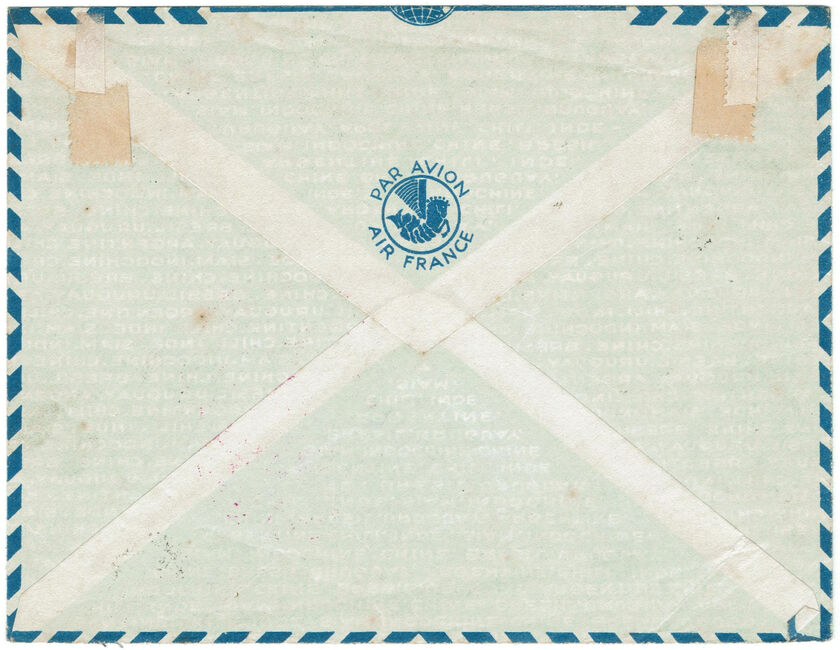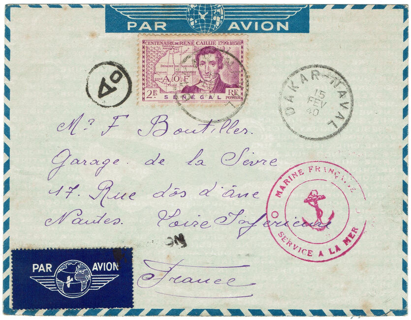 Lettre envoyée le 15 février 1940 de la base de Dakar-naval à destination de Nantes (Loire-inférieure). Marque de censure A0 de Dakar.