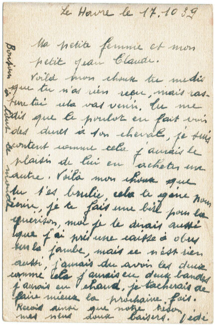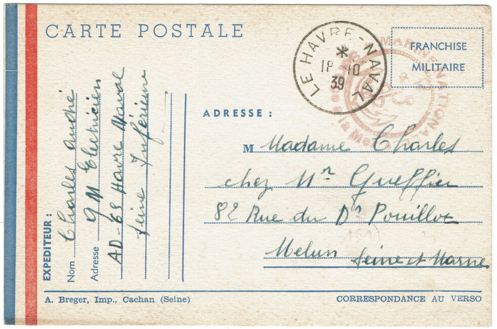 Carte postale de franchise militaire envoyée le 18 octobre 1939 du Havre-naval à destination de Melun (Seine-et-Oise).