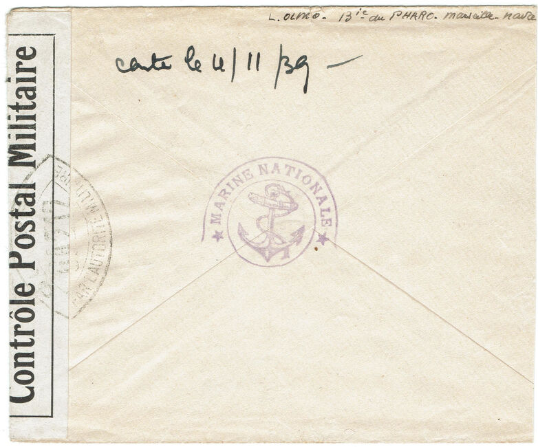 Carte postale envoyée le 19 décembre 1939 de l’intendance maritime de la caserne des Incurables à Marseille et oblitérée du cachet du bureau n°11 de la poste navale (Marseille).