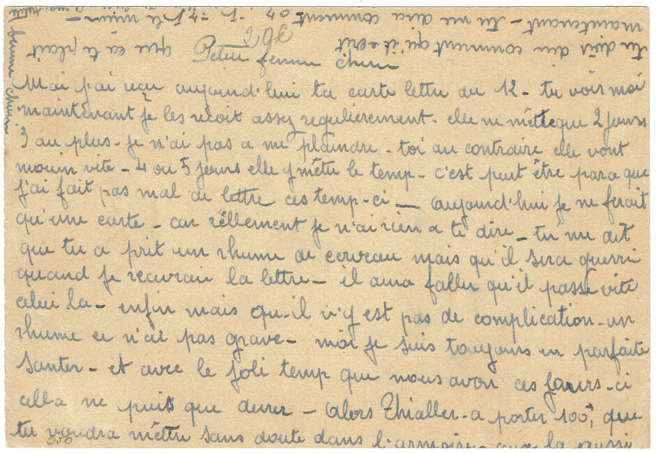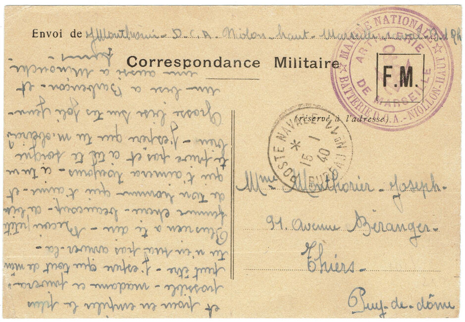 Carte postale envoyée le 15 janvier 1940 du bureau n°11 de la poste navale (Marseille) par un marin affecté à la batterie de DCA de Niolon-haut à destination de Thiers (Puy-de-Dôme). Niolon est mal orthographié dans le cachet de franchise de la Marine.