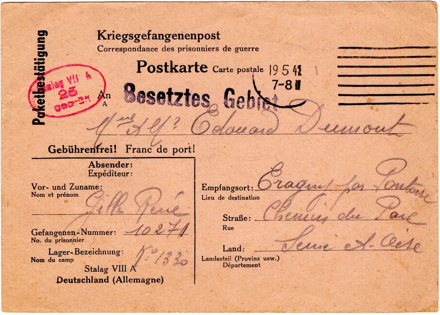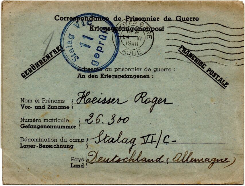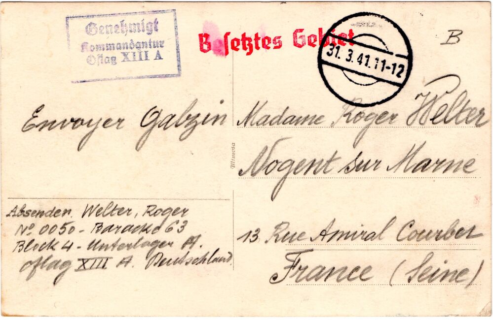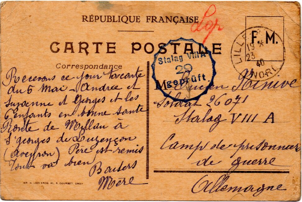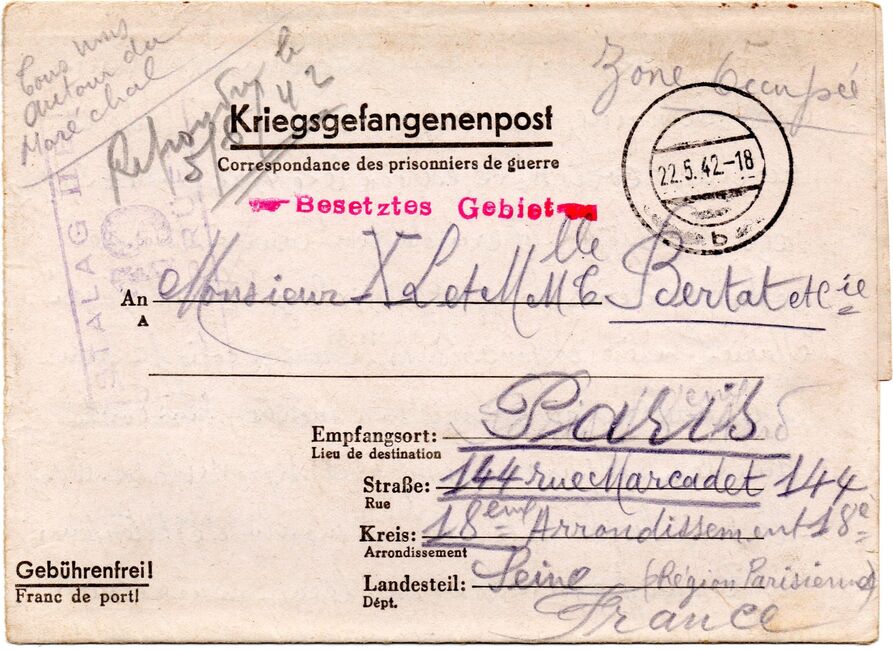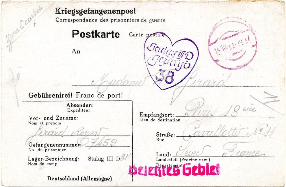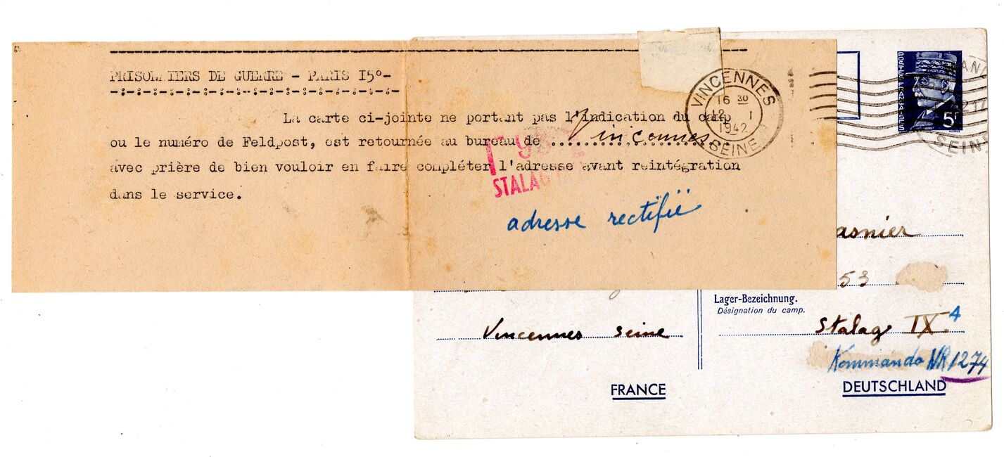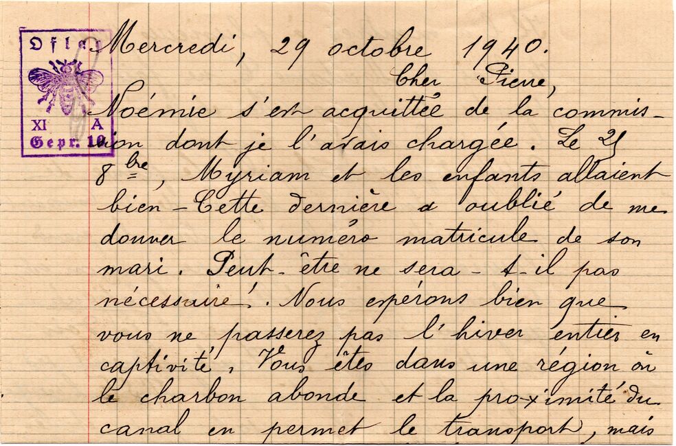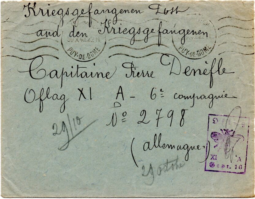 b) centralisation à Paris (rue d’Alleray), et envoi, par l’entremise de la poste militaire allemande, des correspondances adressées de la zone occupée aux prisonniers français en Allemagne ou en Italie. L’envoi des colis postaux et des paquets n’est pas encore autorisé ;
