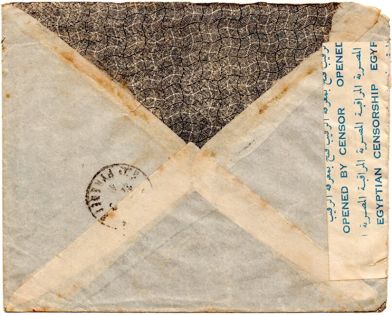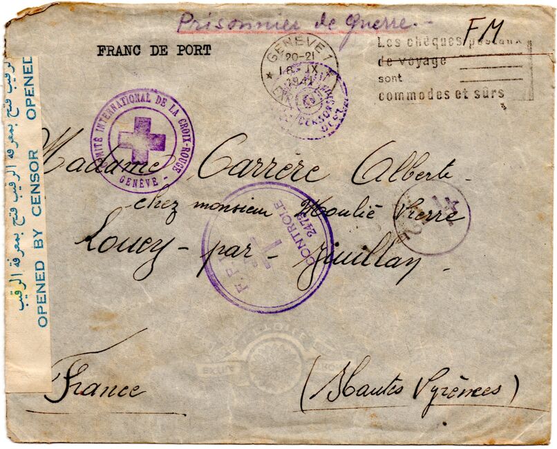 Enveloppe de prisonnier de guerre envoyée du Levant, comme l'attestent les marques à croix de Lorraine (type 13 et type 14 dans la nomenclature de W. Robertson, utilisés dès juillet 1941), acheminée via l'Egypte avec contrôle postal Egyptien et jusqu'à Genève par la Croix-Rouge. La lettre a ensuite été expédiée de Genève le 18 septembre 1941 à destination de la France ou elle est parvenue le 22 septembre.