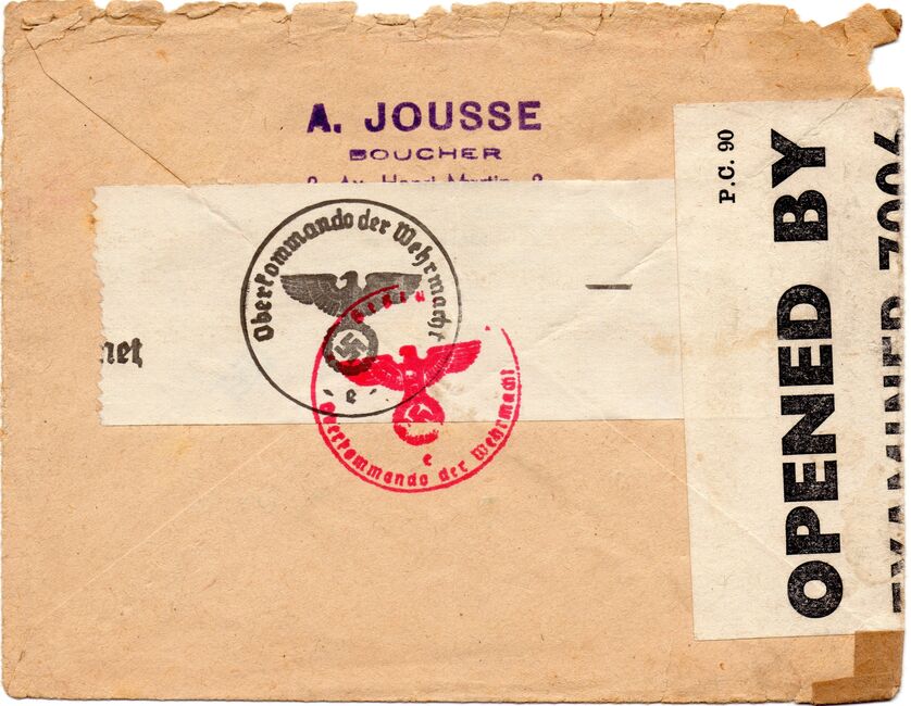 Enveloppe envoyée de Paris le 5 janvier 1943 à destination d'un quartier-maître du sous-marin Bévéziers prisonnier en Grande-Bretagne (camp 24 biffé, et remplacé par 8). Le sous-marin Bévéziers a été coulé le 5 mai 1942 à Diego-Suarez lors de l'opération Ironclad. L'enveloppe a été acheminée via la Croix-Rouge française (les relations postales entre la France occupée et la Grande-Bretagne étant alors interrompues) et a été contrôlée par l'ABP Francfort et par la censure Britannique. La griffe bilingue "Prisonniers de Guerre / Kriegsgefangenen" a probablement été apposée par la Croix-Rouge.